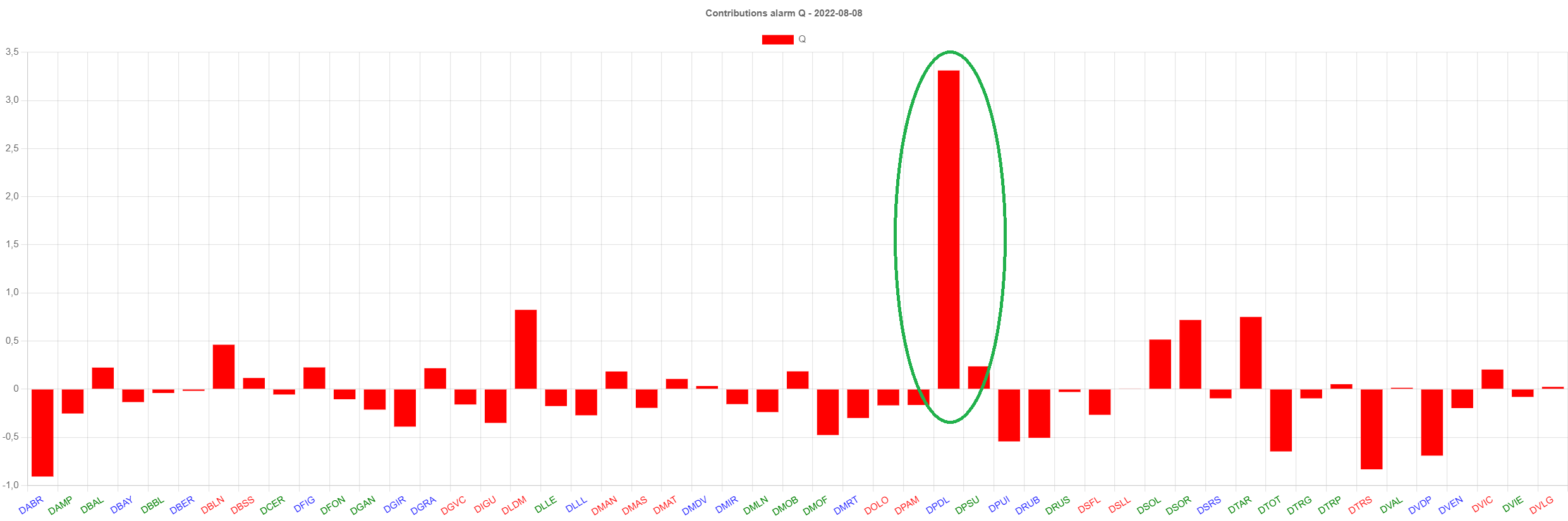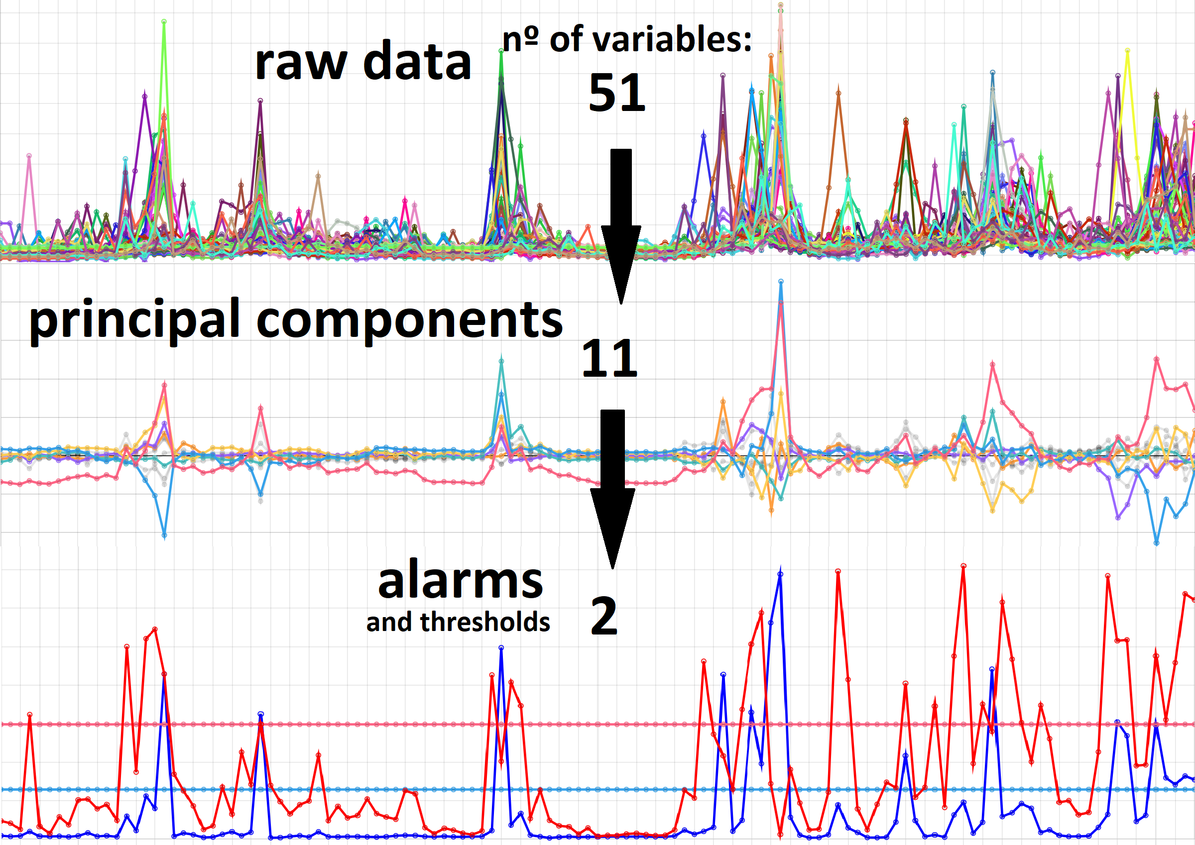 Contribution analysis answers which variable/s in the original space are responsible of the detected fault (threshold trespassing), which we refer to as "alarms" in our study.