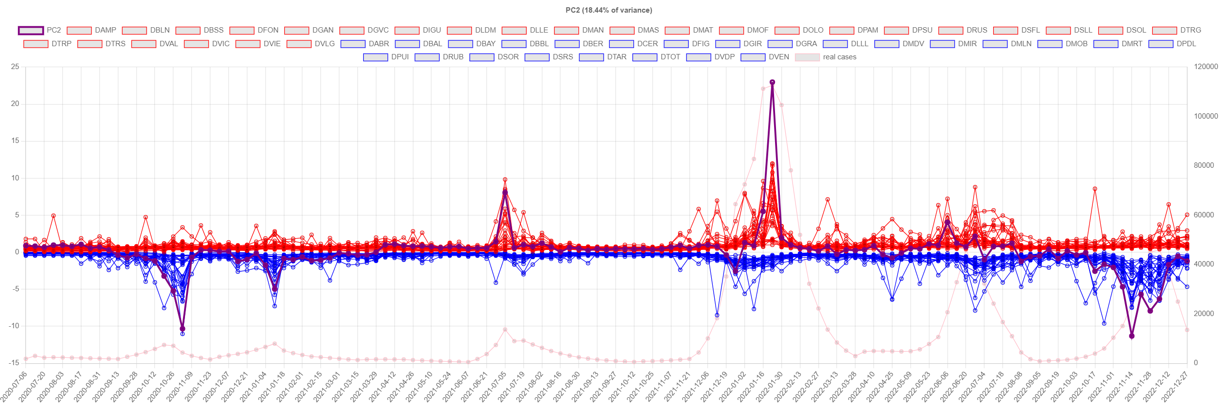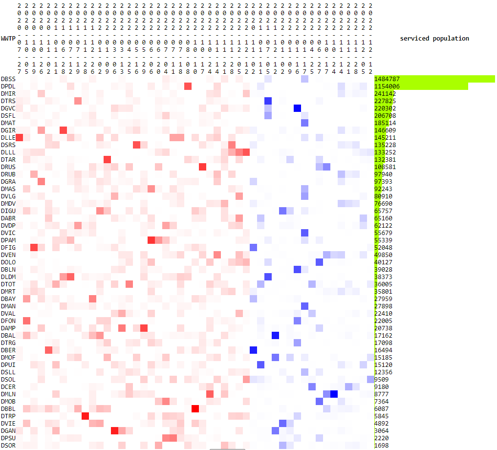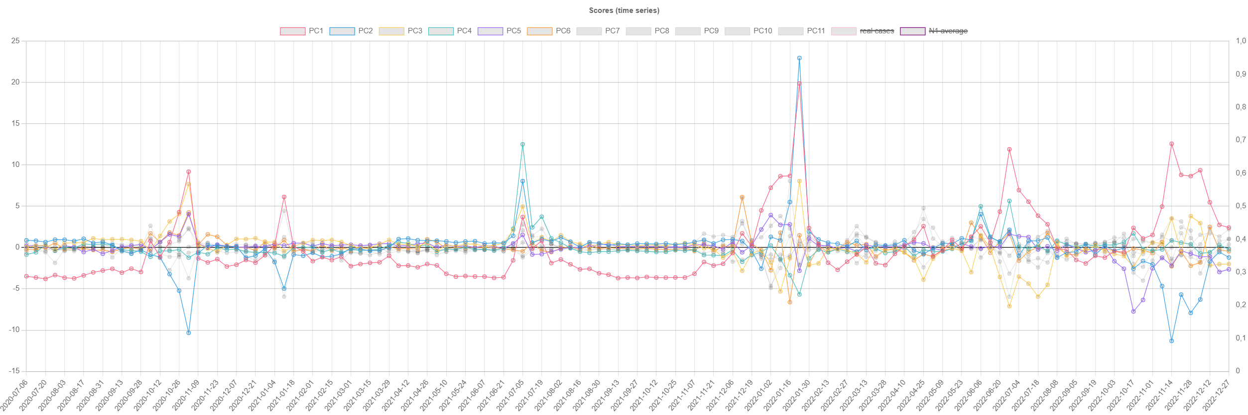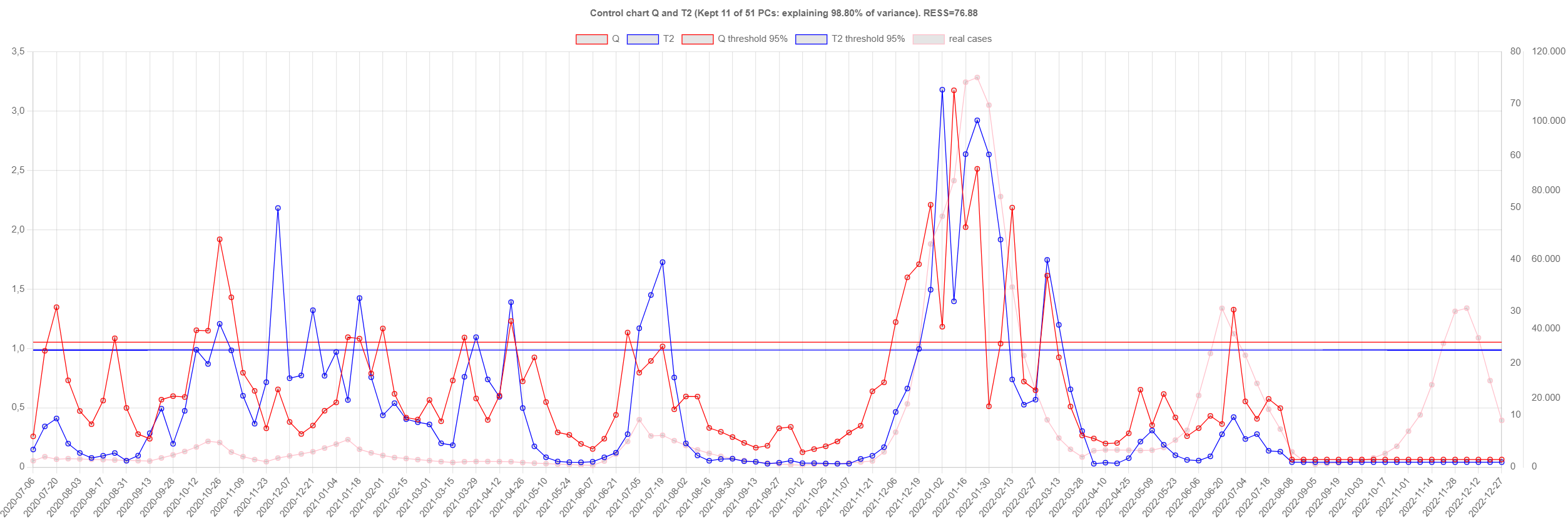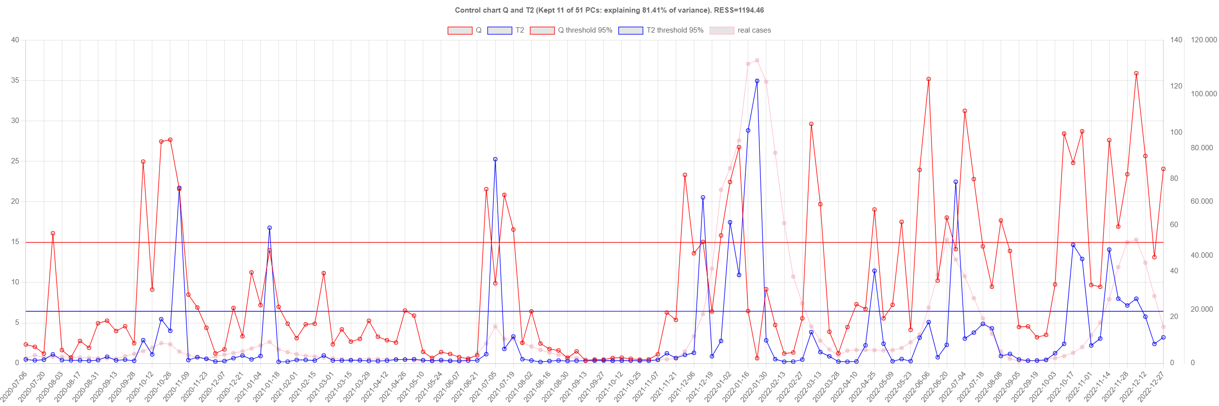 Herein we've applied Principal Component Analysis (PCA, a statistical process control technique) to the time series generated by all WWTPs which are part of SARSAIGUA. This facilitates the identification of single WWTP deviations from the normal behaviour (early warning) and global WWTP deviations from the normal behaviour (generalized outbreak).