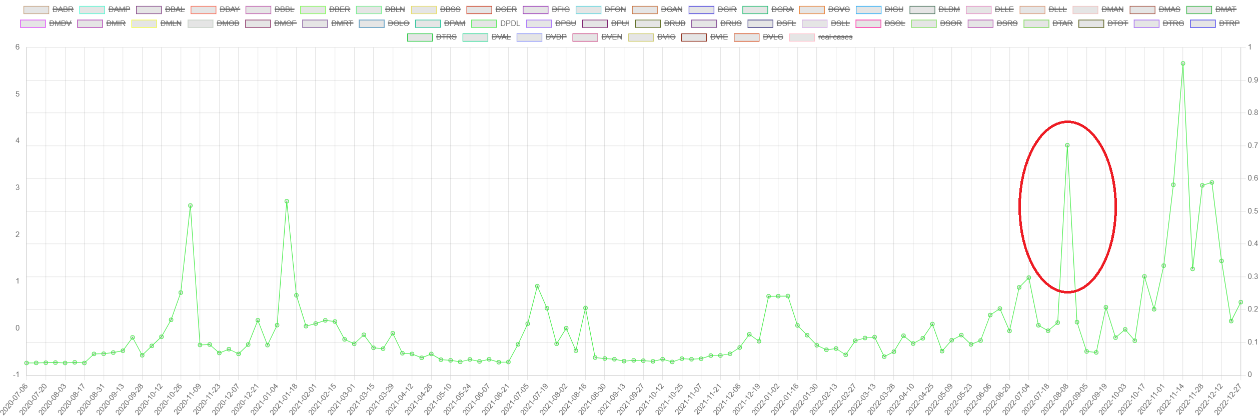 Values of N1/inhabitant at WWTP "DPDL". It spikes at 2022-08-08. The
